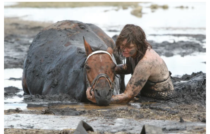 Nicole’s daughter and her horse managed to get escape, but she and Astro sank deeper into the mud. Astro was soon up to his neck in clay and risked choking to death. Nicole spent three hours by Astro’s side in a battle of life and death.